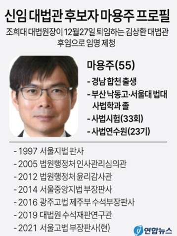 마용주 (馬鏞周, 1969년 7월 1일~)는 대한민국의 법관 출신 대법관 입니다. 마용주는 조희대 대법원장이 제청하고 한덕수 대통령 권한대행이 대법관으로 임명하였습니다. 마용주는 대통령 권한대행에게 임명된 첫 대법관 입니다. 마용주는 윤석열의 사법연수원 동기로 보수 성향이 강한 인사로 분류됩니다.